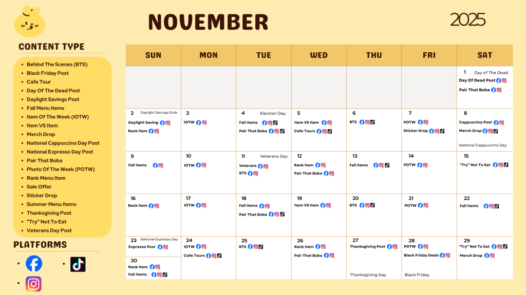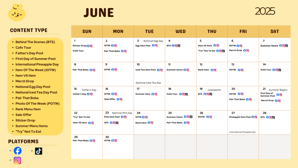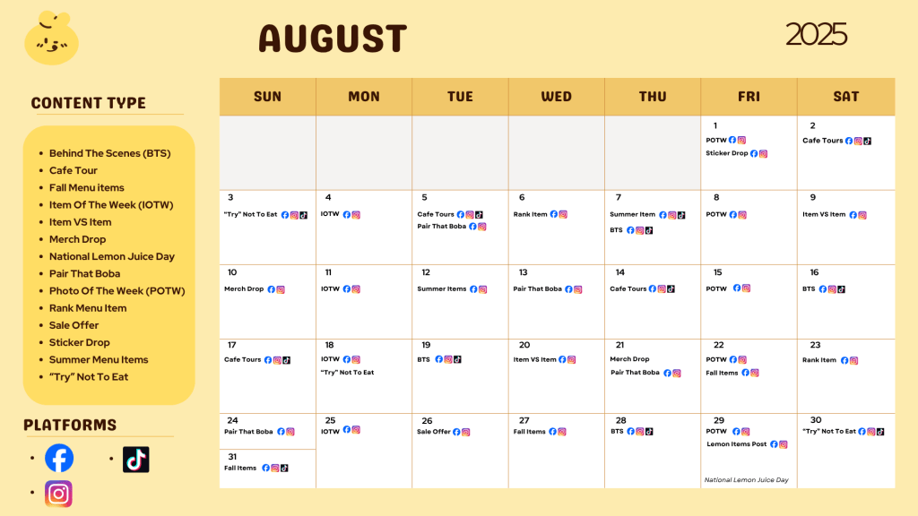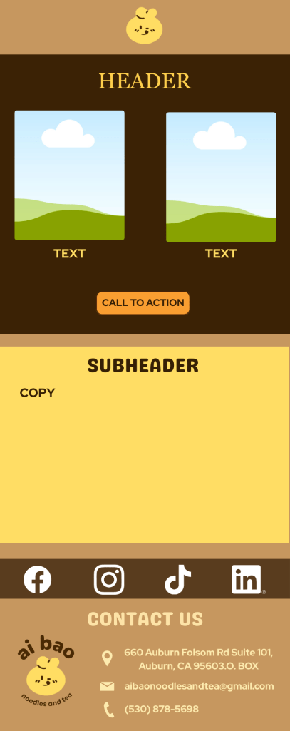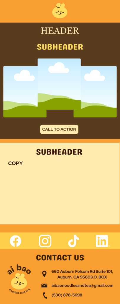 Developed a brand kit containing logos, a color palette and type fonts to help Ai Bao maintain consistency across advertising, digital marketing and social media. Produced marketing content via Canva including flyers, banner ads, merchandise, email campaigns, a website wireframe, social media content ideas and an annual content calendar with templates for social marketing.